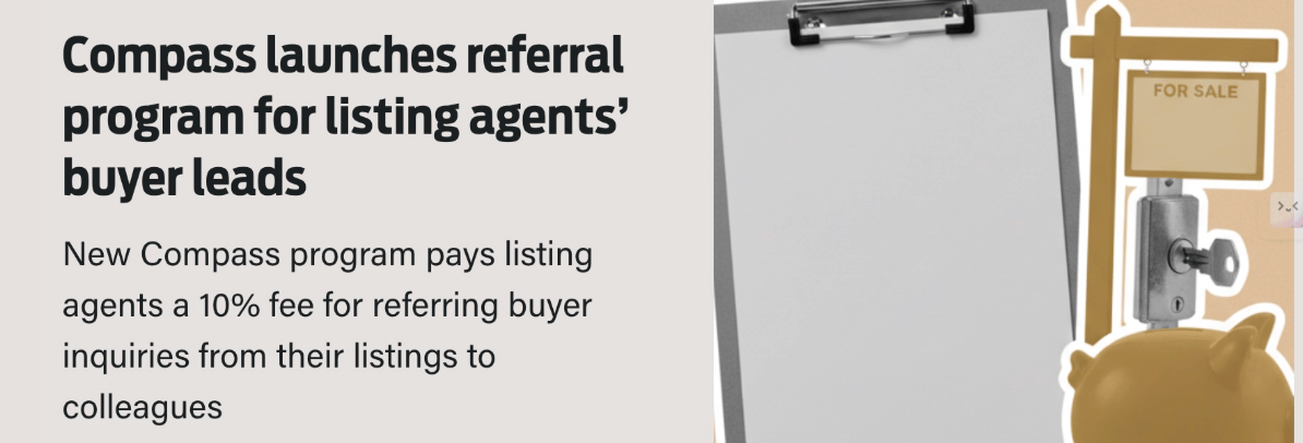 Compass has launched a program allowing listing agents to earn a 10% referral fee for sending buyer leads to other Compass agents. The initiative aims to give agents more control and create new passive income opportunities.