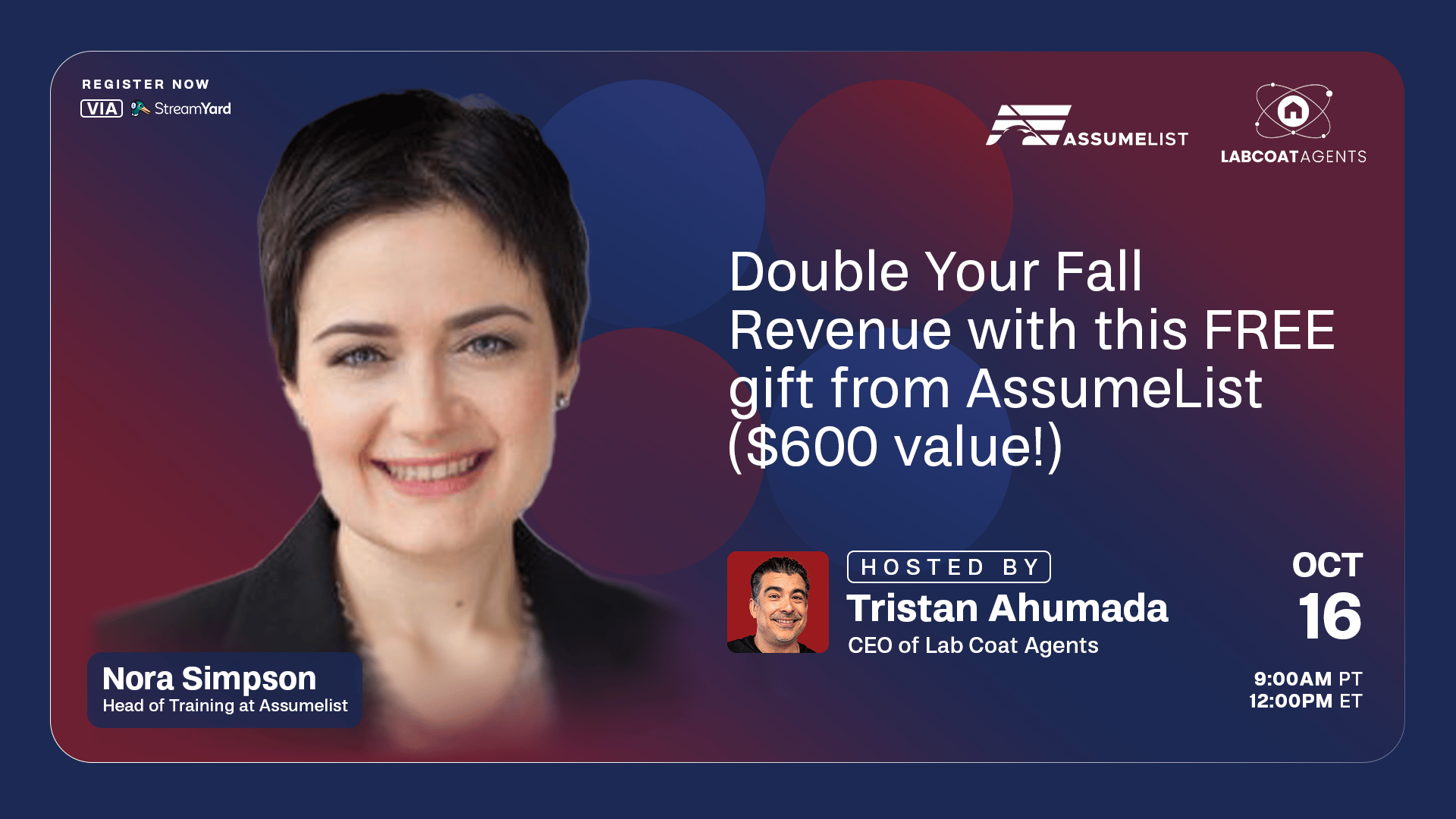 Join AssumeList Head of Training, Nora Simpson, as she reveals the proven strategy that’s helped hundreds of agents 2x their income in just 90 days — and get exclusive access to her $600 secret tool, FREE for attendees only!