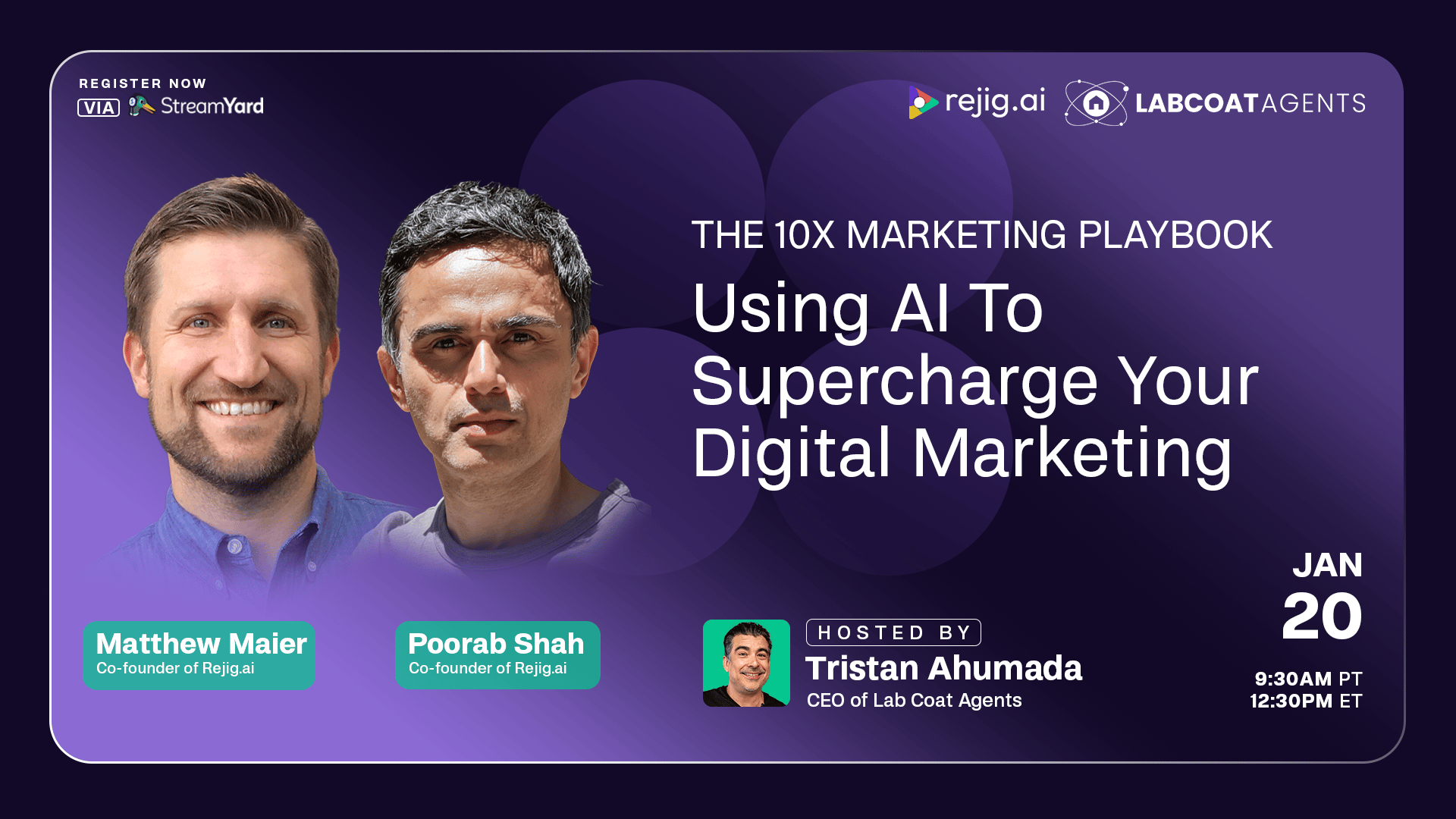 Join Tristan Ahumada, CEO of Lab Coat Agents, alongside Poorab Shah and Matt Maier of Rejig.AI, as they break down practical, real-world strategies you can implement immediately to 10X your marketing efforts using AI.