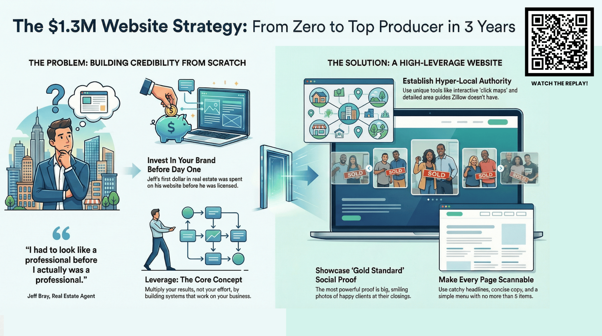 Catch the replay of our session with Jeff Bray, where he walks through the simple website strategy that took him from zero to $1.32M GCI in just 3 years. You’ll see how he used one high-converting site, consistent follow-up, and the right tech stack (AgentFire, Follow Up Boss, Zillow Flex, and more) to dominate his market—without complex funnels or paid ad madness.