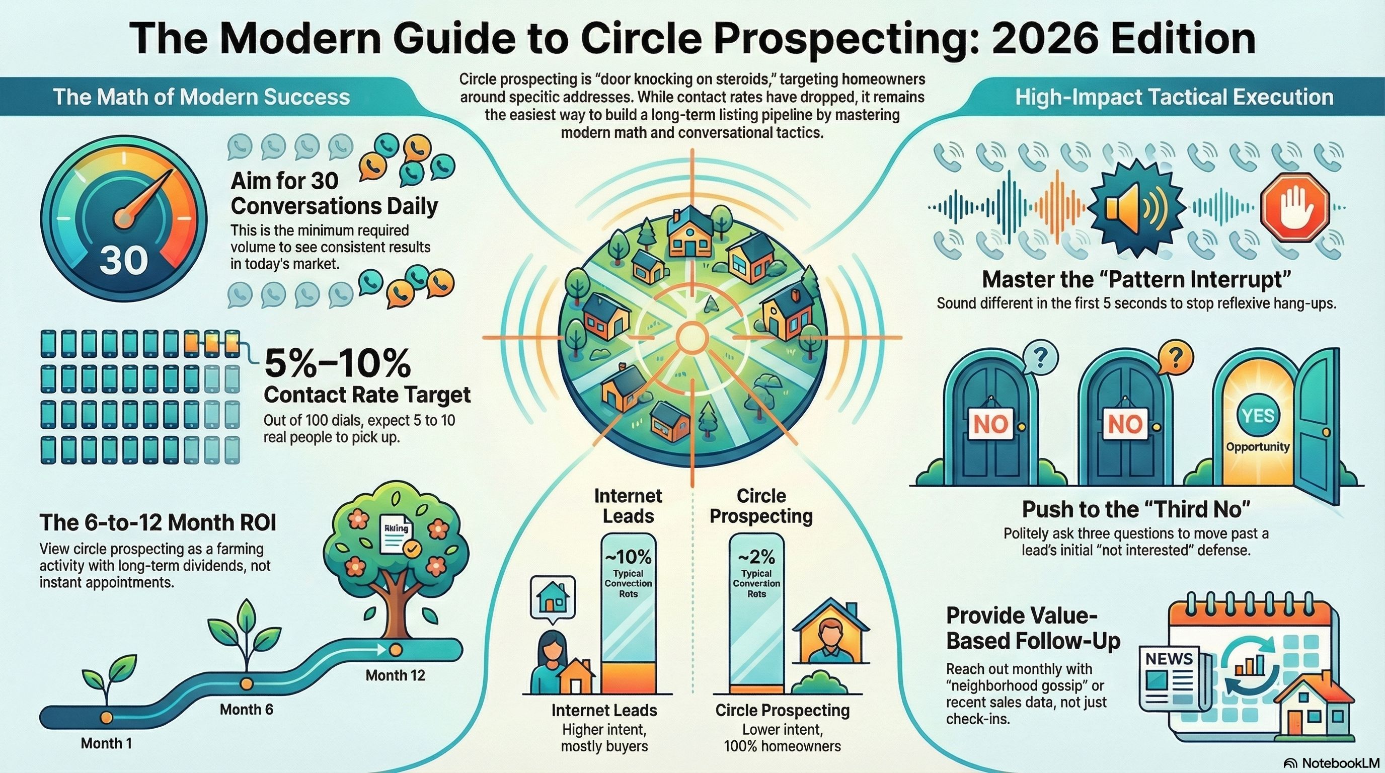 Nick Baldwin and Gus Muñoz Castro break down why circle prospecting is “door knocking on steroids”—a consistent, neighborhood-based way to generate listings even in a low-volume market.
